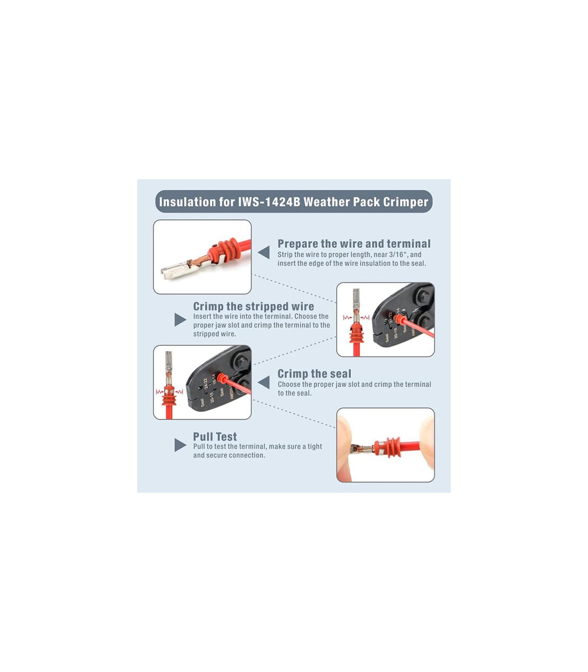 Die RBIWS-1424B ist eine Ratschen-Crimpzange, entwickelt für das präzise Crimpen von nicht isolierten Steckern wie Weather Pack und Metri-Pack, die in automobilen, Motorrad-, Marine- und Industrieverkabelungssystemen verwendet werden.