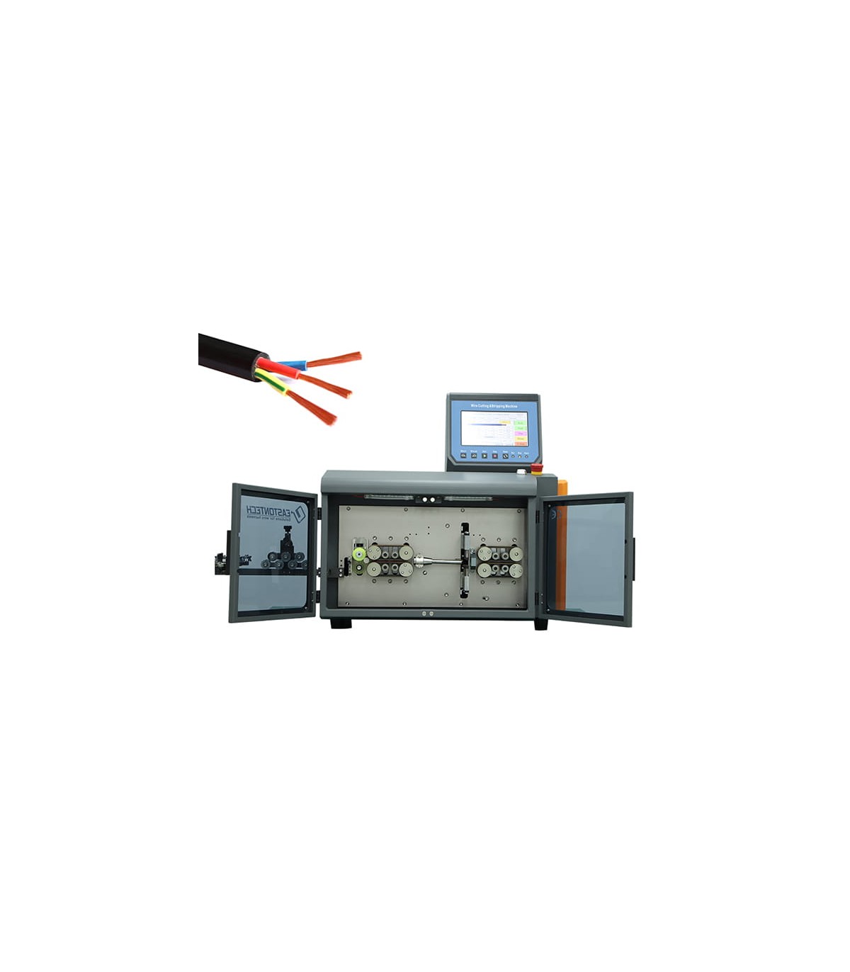 The machine is designed to perform fully automatic cable cutting and insulation stripping operations, both outer and inner, on multi-core cables.