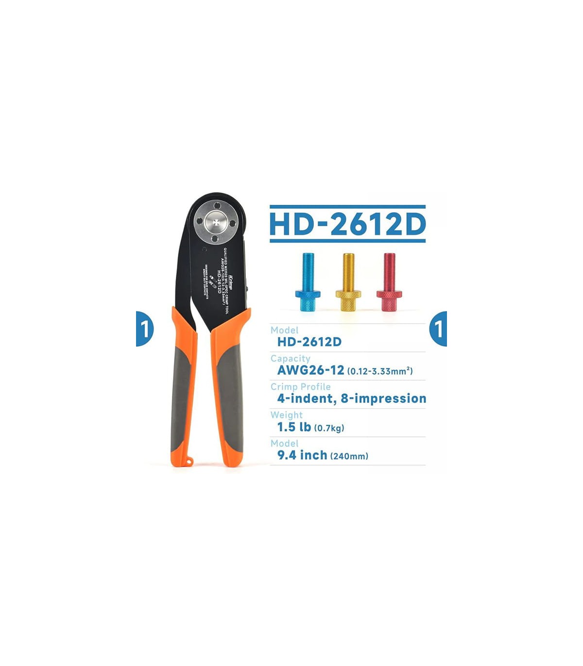 The RBHD-2612D is a high-quality crimping tool designed to provide fast, precise and reliable crimping of ferrules and insulated terminals. Suitable for a wide range of applications: industrial and civil installations, electrical panels, automation, vehicles and electronic devices.
