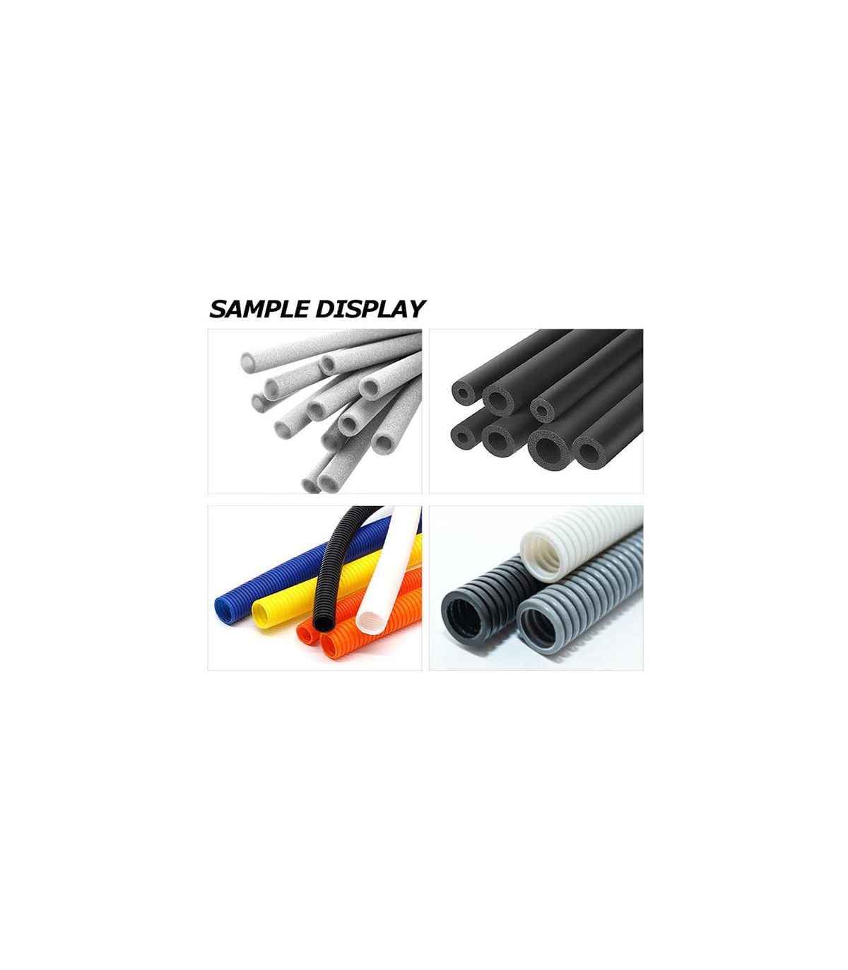 Esta máquina está diseñada para trabajar de forma flexible con tubos y fundas, pero también con tiras, cintas, láminas finas, además de cables e incluso cuerdas: en la práctica, es una máquina de taller útil cuando en producción pasan materiales diferentes, pero la necesidad siempre es la misma: cortar rápido, con longitud controlada y con el mínimo desperdicio.