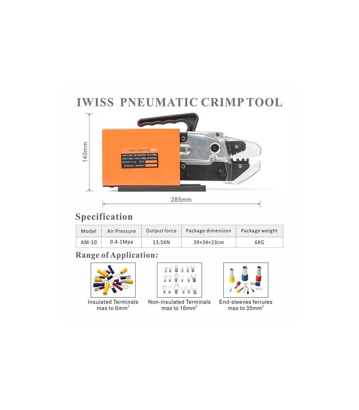 Pince à sertir pneumatique pour embouts de câble et bornes non isolées (0,5 - 16 mmq)