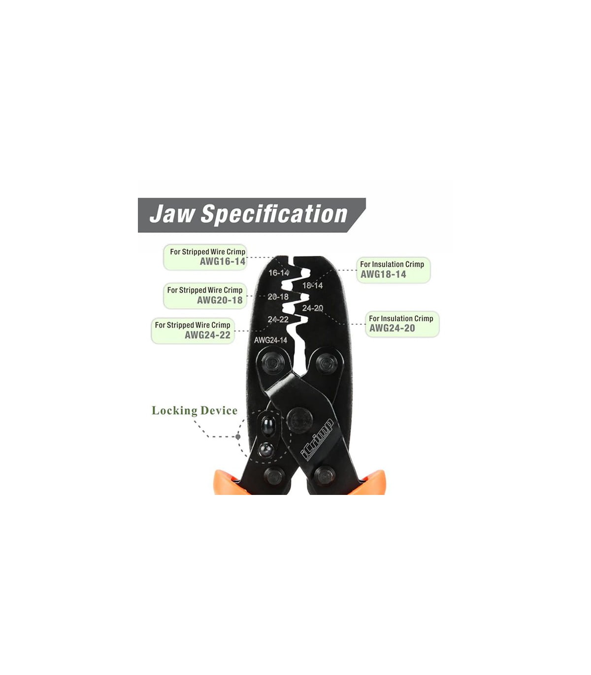 La RBIWS-1424A è una pinza crimpatrice a cricchetto progettata per la lavorazione precisa di terminali open barrel non isolati utilizzati in connettori Molex, Delphi, AMP-Tyco, Deutsch e applicazioni automotive, elettroniche e informatiche.