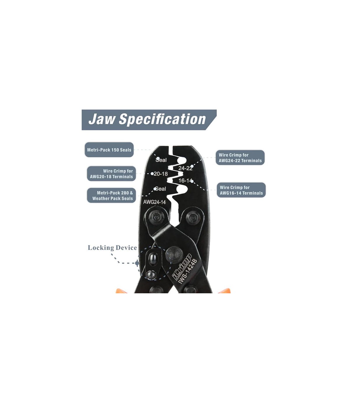 La RBIWS-1424B è una pinza crimpatrice a cricchetto per la lavorazione precisa di terminali non isolati tipo Weather Pack e Metri-Pack, utilizzati nei sistemi di cablaggio automotive, motociclistici, marini e industriali.